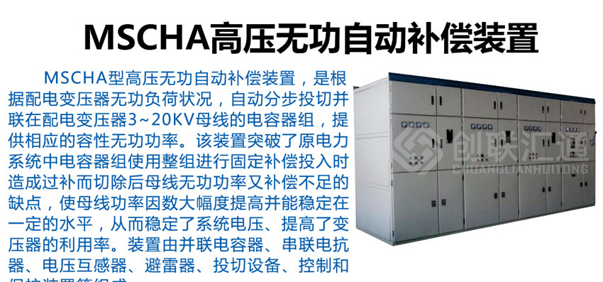 MSCHA型高壓無功自動補償裝置,是根據(jù)配電變壓器無功負(fù)荷狀況,自動分步投切并聯(lián)在配電變壓器3~20kV母線的電容器組,提供相應(yīng)的容性無功功率。該裝置突破了原電力系統(tǒng)中電容器組使用整組進行固定補償投入時造成過補而切除后母線無功功率又補償不足的缺點,使母線功率因數(shù)大幅度提高并能穩(wěn)定在一定的水平,從而穩(wěn)定了系統(tǒng)電壓、提高了變壓器的利用率。裝置由并聯(lián)電容器、串聯(lián)電抗器、電壓互感器、避雷器、投切設(shè)備、控制和保護裝置等組成。